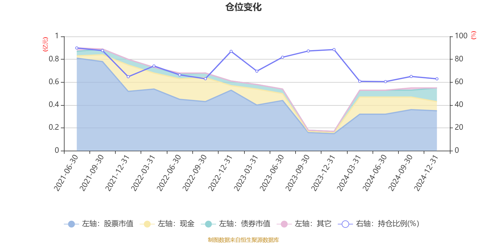 据定期报告数据统计,近三年平均股票仓位为72.26%,同类平均为83.34%。2021年上半年末基金达到89.93%的最高仓位,2024年上半年末最低,为60.51%。